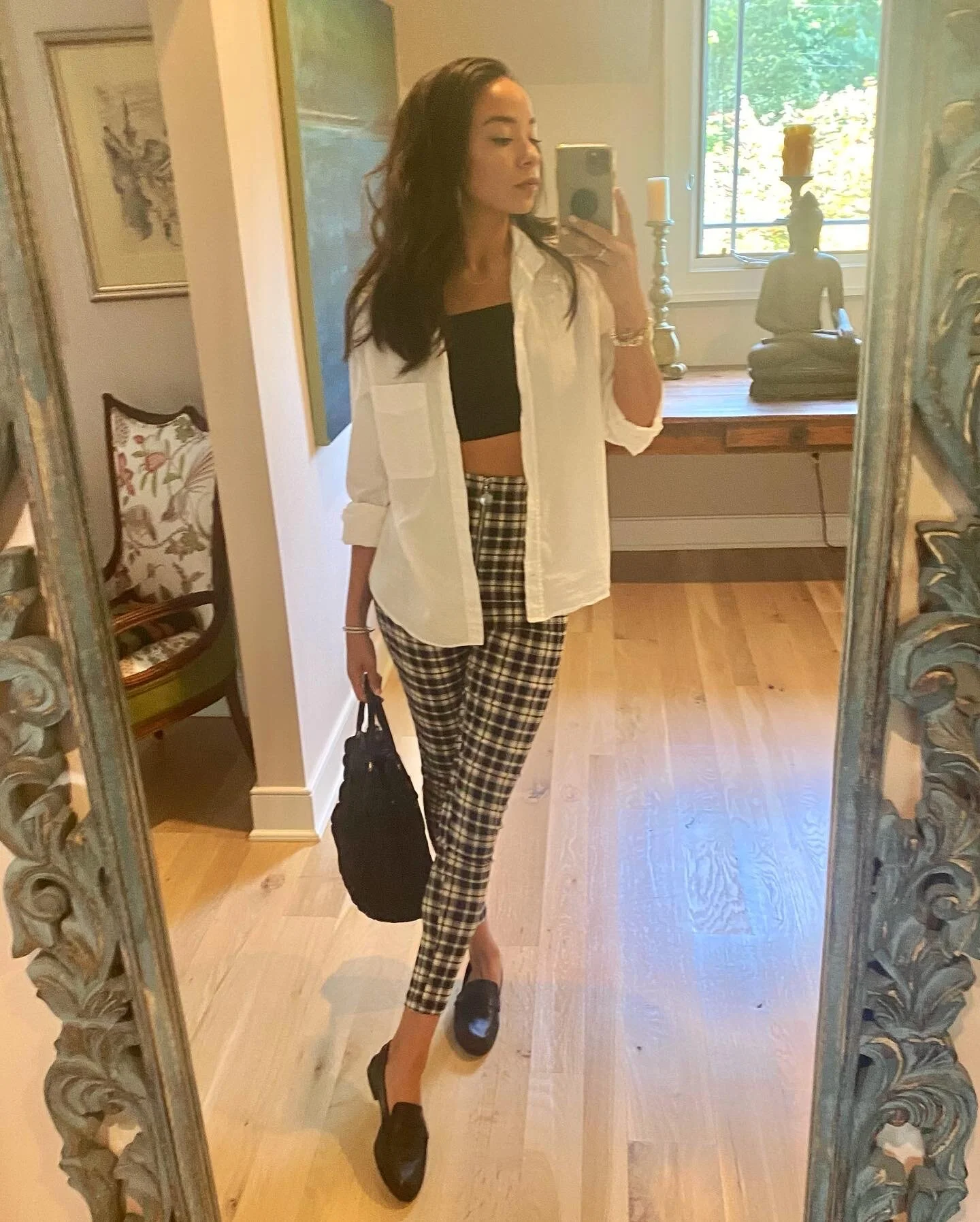 Sep 28 Sep 28 How To Style : Plaid Ella Barnette Style Guides, Fashion Similar CoatBlack Knit DressSimilar Bootie Clutch Similar BlazerCrop topGrey Denim Black Bootie Similar Black Crossbody White Button UpPlaid LeggingBlack Crop topLoaferTop Handle Bag